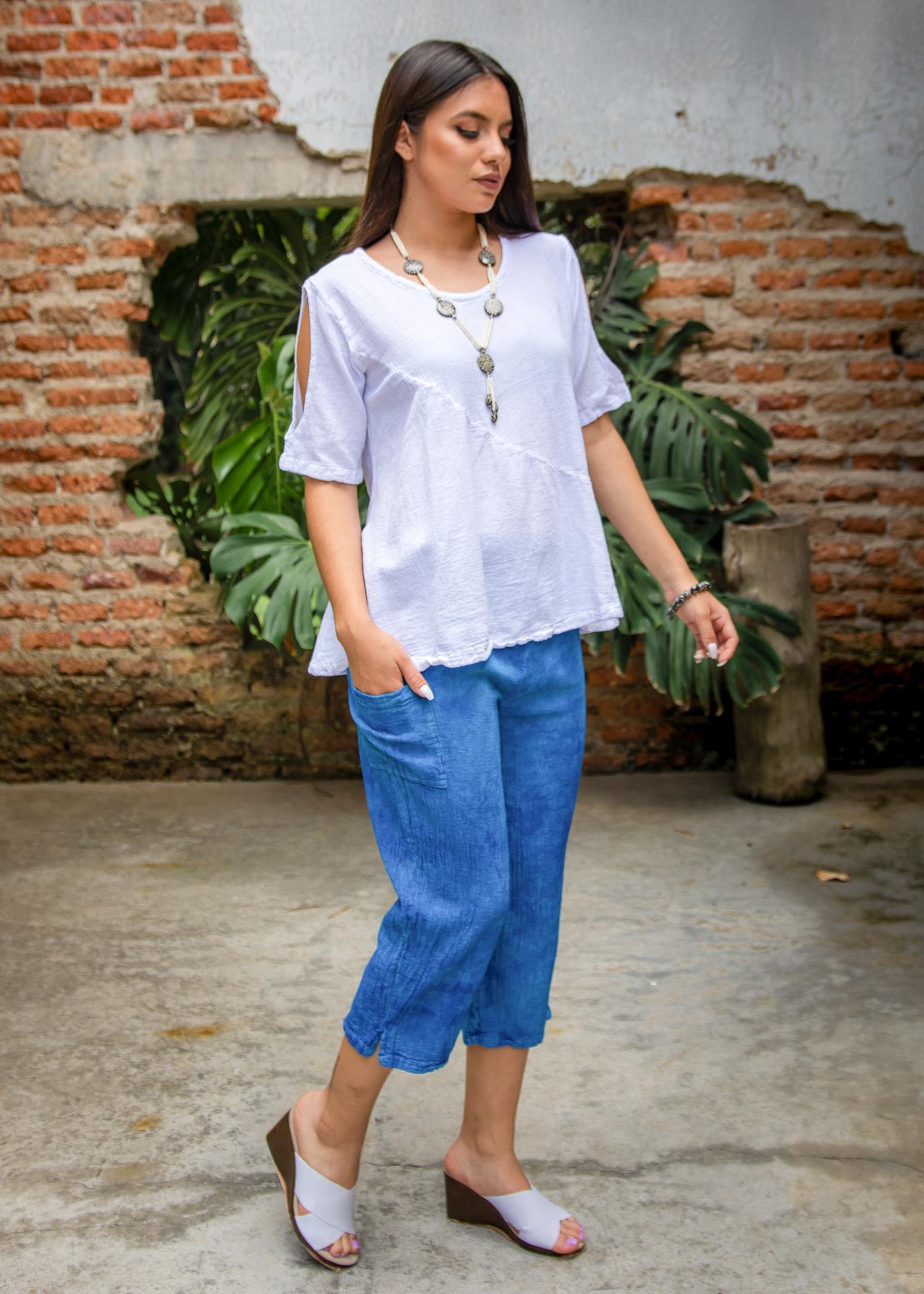 HERMOSO PANTALÓN CAPRI RECTO, BOLSILLOS DE PARCHE DECORADOS CERCA DEL BAJO, CINTURA ELÁSTICA.